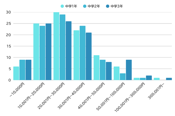 中学1年生、2年生、3年生のいずれの学年も2万円~3万円の割合が最も高く、次いで1万円~2万円の割合が高くなっています。中学2年生においては、3万円~4万円の割合も同じくらい高くなっています。