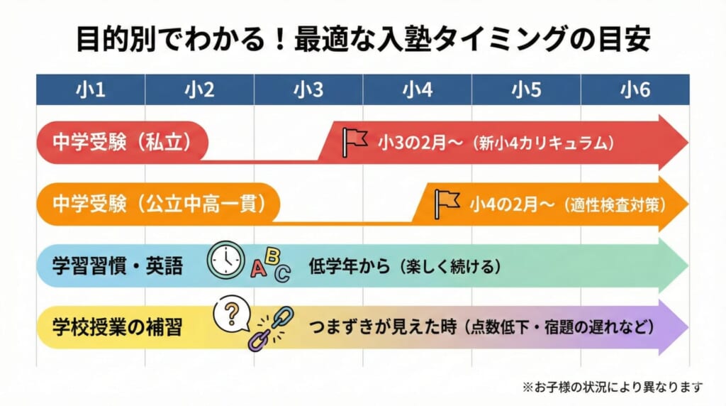 ただし、最適な入塾時期は一律ではありません。中学受験なら小3の2月、学習習慣の定着なら低学年から、補習目的ならつまずきが見えたタイミングなど、目的によって大きく異なります。