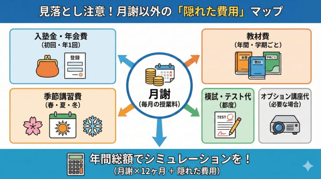 入塾前に、次の費用が「月謝以外」にどれくらいかかるかも確認しておくと安心です。