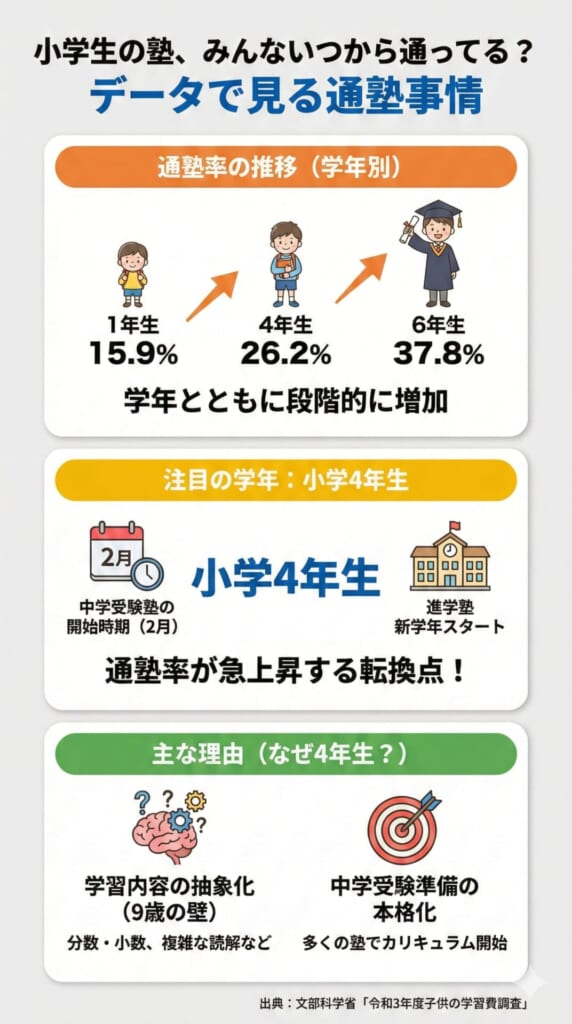 小学生の塾通いは、学年が上がるにつれて段階的に増加し、特に小学4年生で大きな転換点を迎えます。