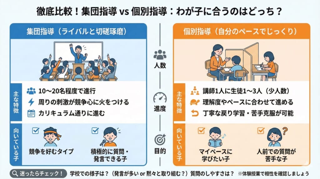 塾選びでは、集団指導か個別指導かを最初に決めておくと比較がしやすくなります。