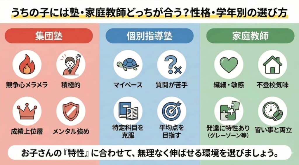 塾と家庭教師のどちらを選ぶかは、お子さんの性格や学習習慣、成長段階によって大きく左右されます。積極的に質問できる子と内向的な子、競争を好む子とマイペースな子では、最適な学習環境が全く異なります。