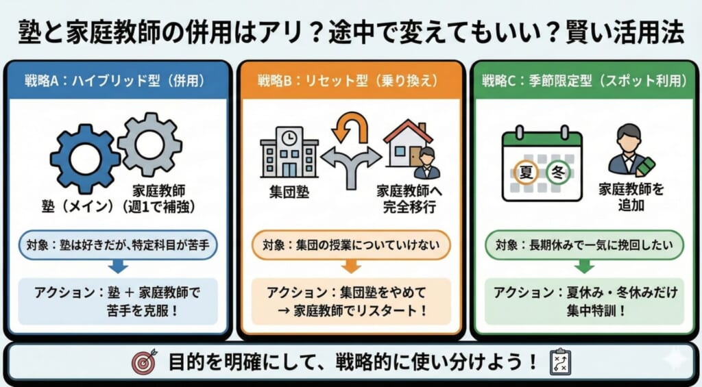 塾と家庭教師は必ずしも「どちらか一方を選ぶ」ものではありません。それぞれの強みを活かした併用や、お子さんの成長段階に応じた柔軟な切り替えも有効な選択肢です。集団塾で受験情報と競争環境を得ながら、家庭教師で個別の弱点を補強する併用パターンや、学習状況の変化に応じて最適なサービスに移行する戦略など、固定的な選択にとらわれない活用方法を理解することで、教育投資の効果を最大化できます。