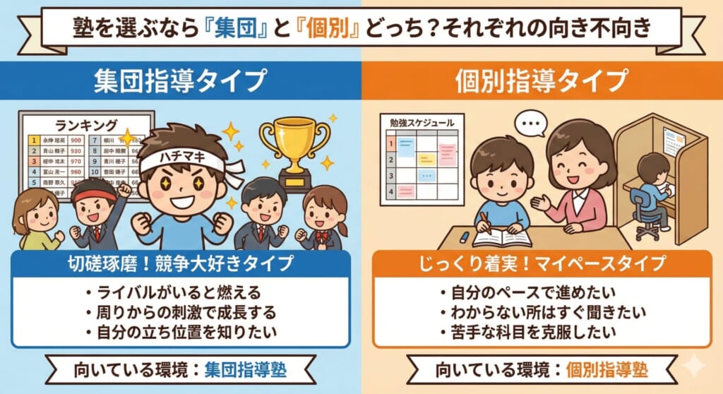 | 適している子ども | ・負けず嫌いで競争を好む性格・基礎学力がある程度定着している ・集団の中で刺激を受けて成長するタイプ | ・質問が苦手な内向的な性格・特定科目で大きく遅れている ・自分のペースで学習したいタイプ |