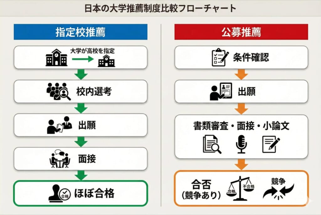 指定校推薦は、大学が特定の高校に推薦枠を設ける方式で、公募推薦は出願条件を満たせば全国の高校生が出願できる方式です。