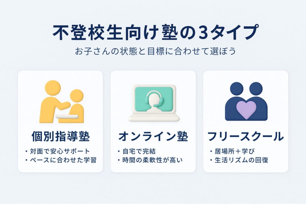 不登校生向けの塾は、従来の一般的な学習塾とは異なる特徴を持っています。大きく分けて「個別指導塾」「オンライン塾」「フリースクール」の3つのタイプがあり、それぞれが異なるアプローチで学習支援を行っています。お子さんの心理状態や学習状況、将来の目標に応じて最適な塾のタイプを選ぶことがポイントとなります。