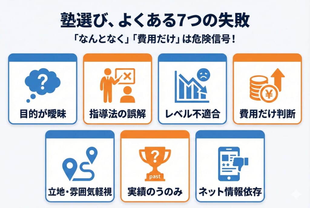 実際の塾選びでは、多くの保護者が同様の失敗を繰り返しています。これらの失敗は時間と費用の負担を増やすだけでなく、お子さんの学習意欲を削いでしまう原因になってしまうこともあります。ここでは、塾選びで特に多い7つの失敗パターンと、その具体的な対策を詳しく解説していきます。事前にこれらの失敗例を知っておくことで、同じような失敗を避けることができ、お子さんに最適な学習環境を提供することができるでしょう。