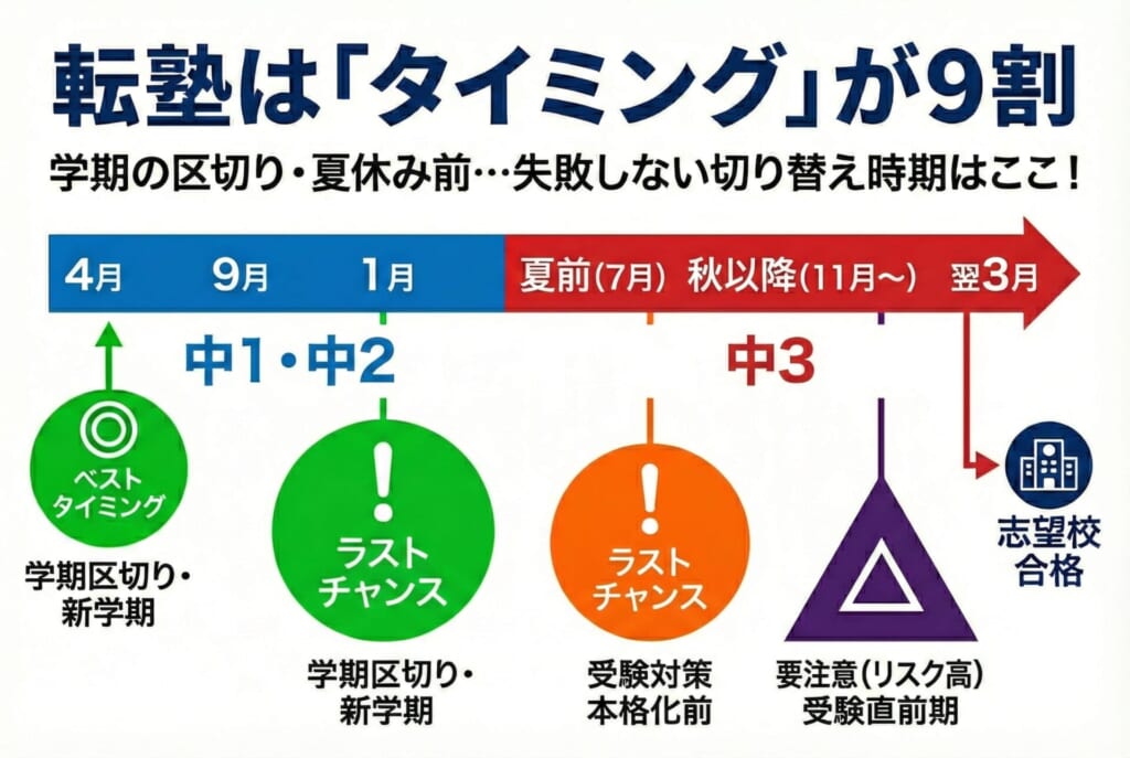中学3年生の転塾は特に慎重な判断が必要です。遅くとも夏休み前までに転塾を完了させることが重要で、夏期講習から新しい環境でスタートできるよう準備しましょう。受験直前期(11月以降)の転塾は環境変化によるリスクが高く、よほどの事情がない限り避けたい時期です。