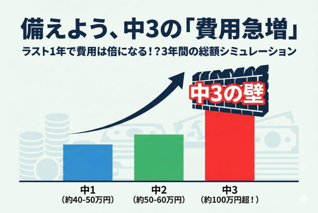 塾にかかる費用を計画するには3年間の総額の予算を事前に考えておき、学年ごとに配分することが重要です。一般的に中学3年生の費用が最も高く、中学1年生の2倍程度になるケースが多くあります。中学1年生で年間40万円の場合、中学3年生では年間80万円から100万円程度を見込む必要があります。