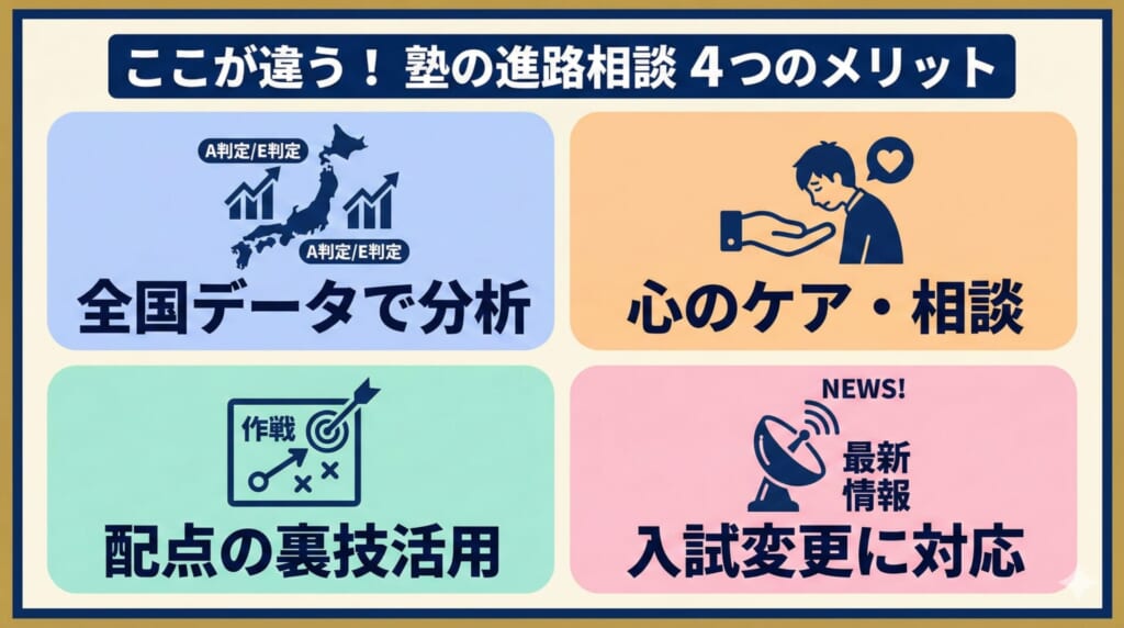 塾の進路相談を利用する最大の利点は、情報の非対称性の解消と、個別に最適化された戦略構築 にあります。この章では、塾の進路相談ならではの4つのメリットを具体的に解説します。