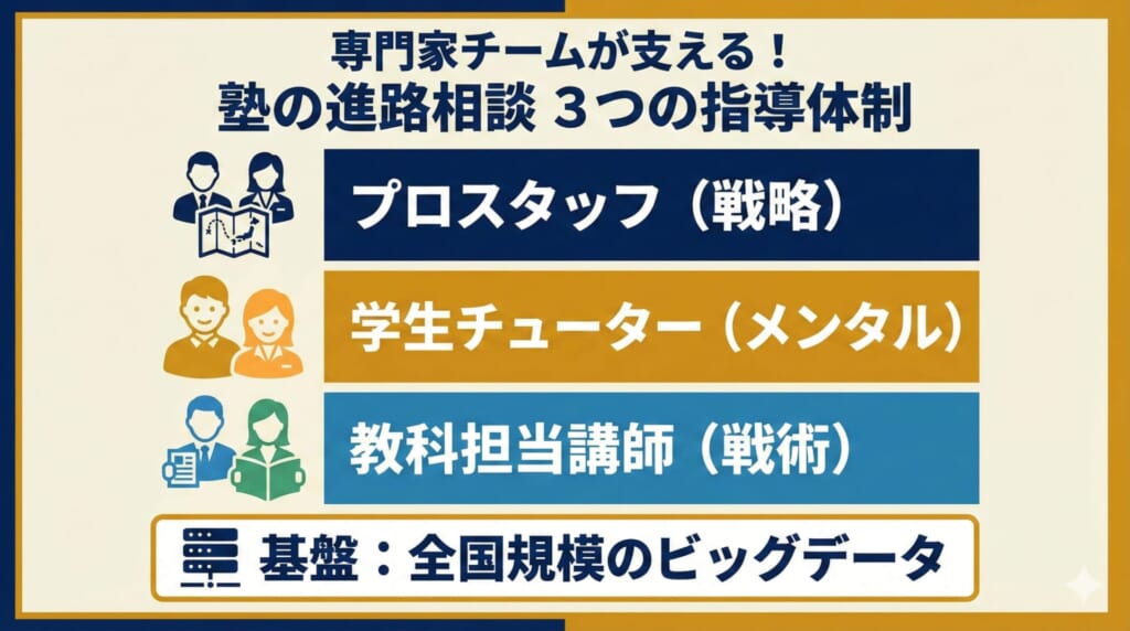 大手予備校や進学塾では、進路相談を複数の専門家が分担して担当しています。これが学校の担任教師中心の指導体制とは異なる、塾の専門分業システムの特徴です。