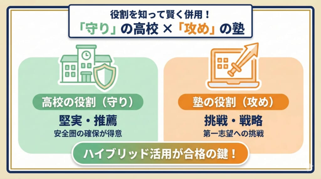 高校と塾、どちらか一方だけに頼るのではなく、両方の強みを活かす「ハイブリッド活用」が最も効果的 です。