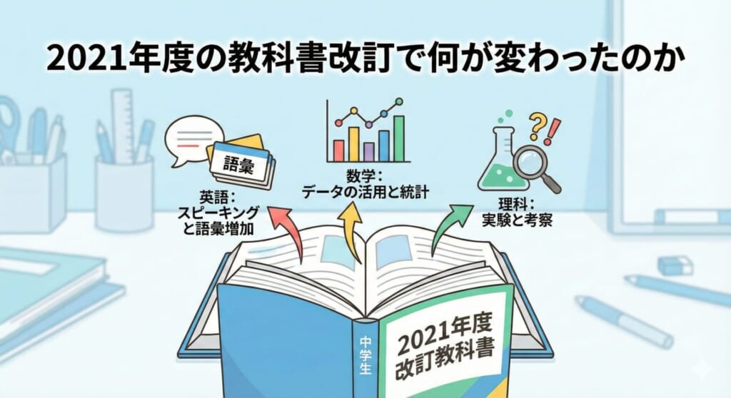 2021年度から使用されている中学校の教科書は、それ以前のものと比べて大きく変わっています。特に英語では語彙数が1.5倍に増え、数学や理科でも「考える力」を問う内容が大幅に増加しました。教科書が変わったことで、子どもたちの学習負担は確実に増えています。しかし、変化の内容を正しく理解すれば、適切な対策を取ることができます。
