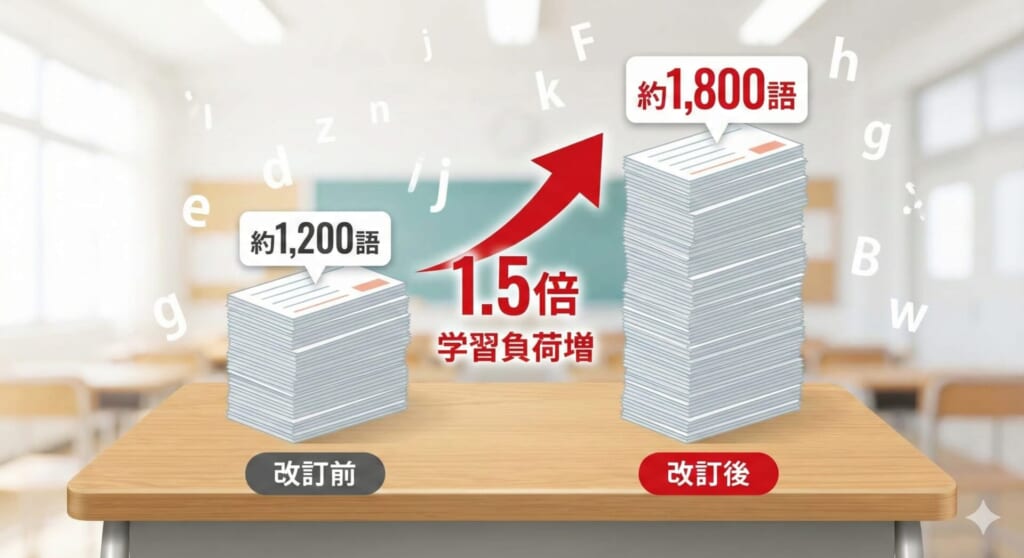 改訂前の教科書では、中学3年間で学ぶ単語数は約1,200語でした。改訂後は1,600〜1,800語に増加しています。これだけを聞くと「400〜600語増えただけ」と感じるかもしれませんが、実際の影響は想像以上に大きいものです。