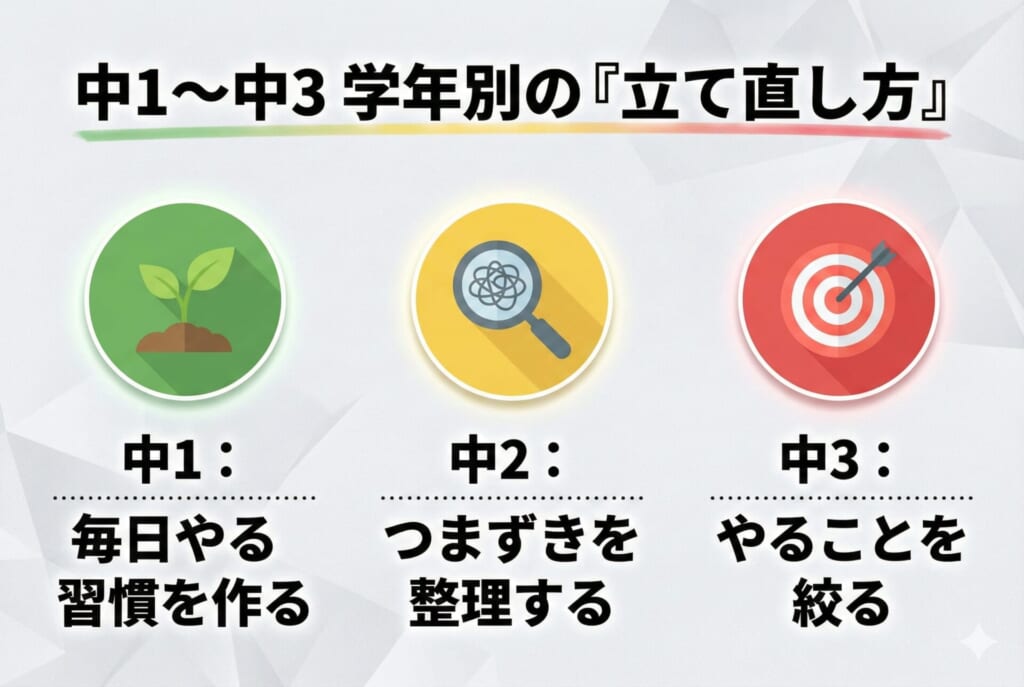 - 中1〜中3:学年別の立て直し方