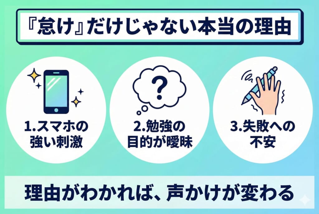 子どもが勉強に向かえない背景には、つまずきや不安、生活リズム、スマホなど環境要因が重なっていることがあります。意志の弱さだけで片づけられないケースも多いです。