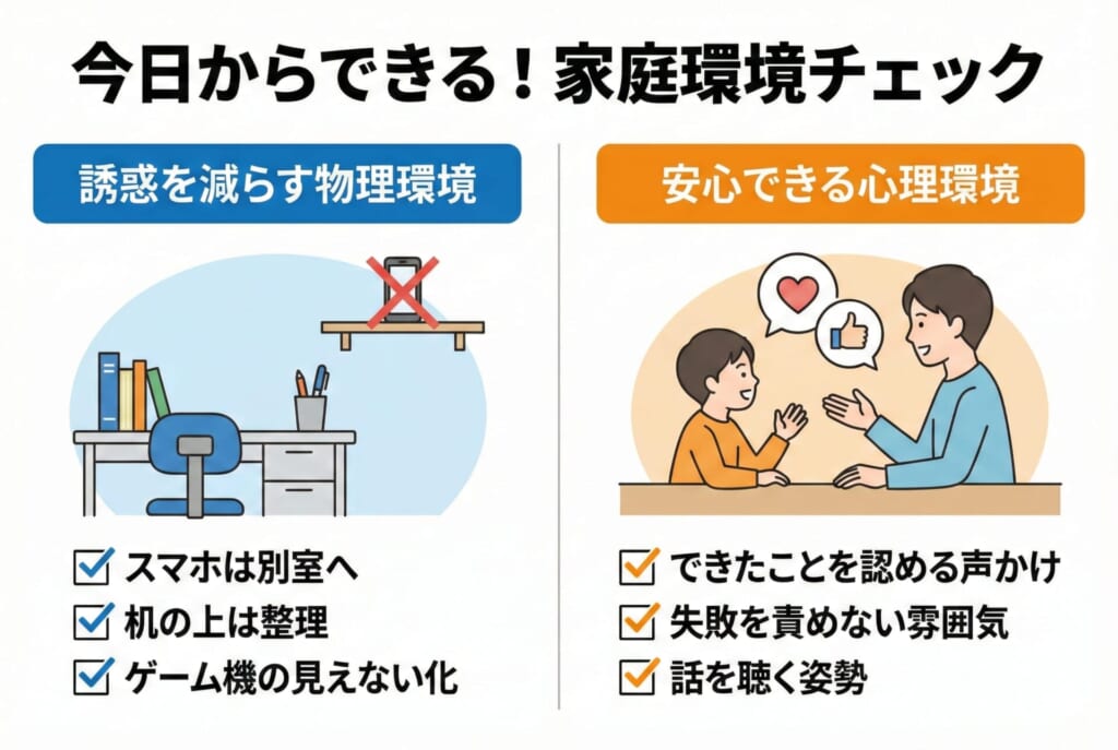 家庭でできることを考えるときは、「監視する」より「整えて支える」視点が役立ちます。