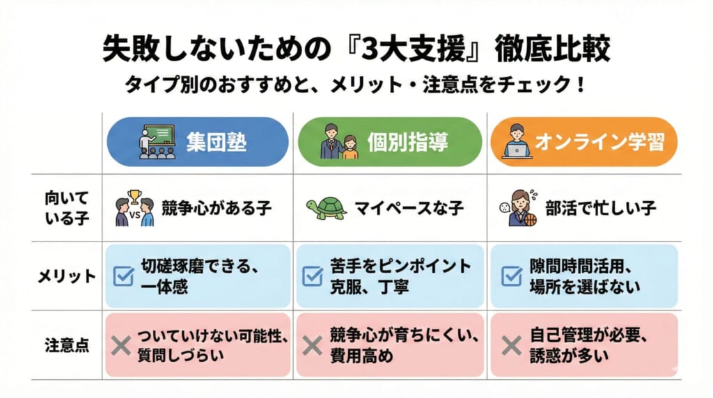 たとえば「理解が追いついていない」なら個別指導、「周囲の刺激が必要」なら集団塾、「時間が取りづらい」ならオンライン家庭教師が候補になります。