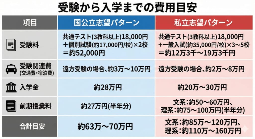 大学受験には想像以上に多くの費用がかかります。受験料だけでなく、模試代、参考書代、塾・予備校費用、さらに遠方の大学を受験する場合は交通費や宿泊費も必要です。
