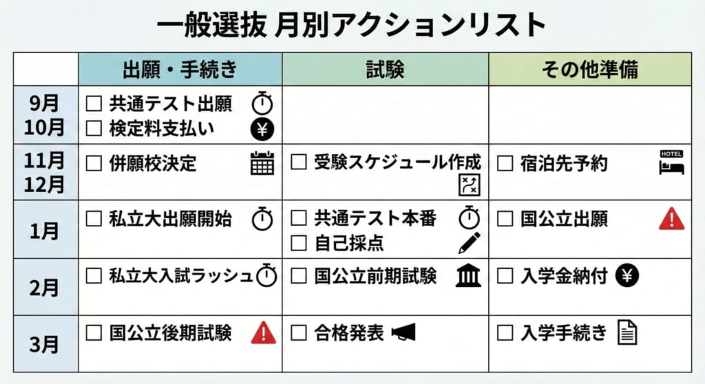 一般選抜は手続きが最も複雑です。「勉強」と並行して「事務作業」の抜け漏れが命取りになるため、時期ごとのタスクを整理しておきましょう。