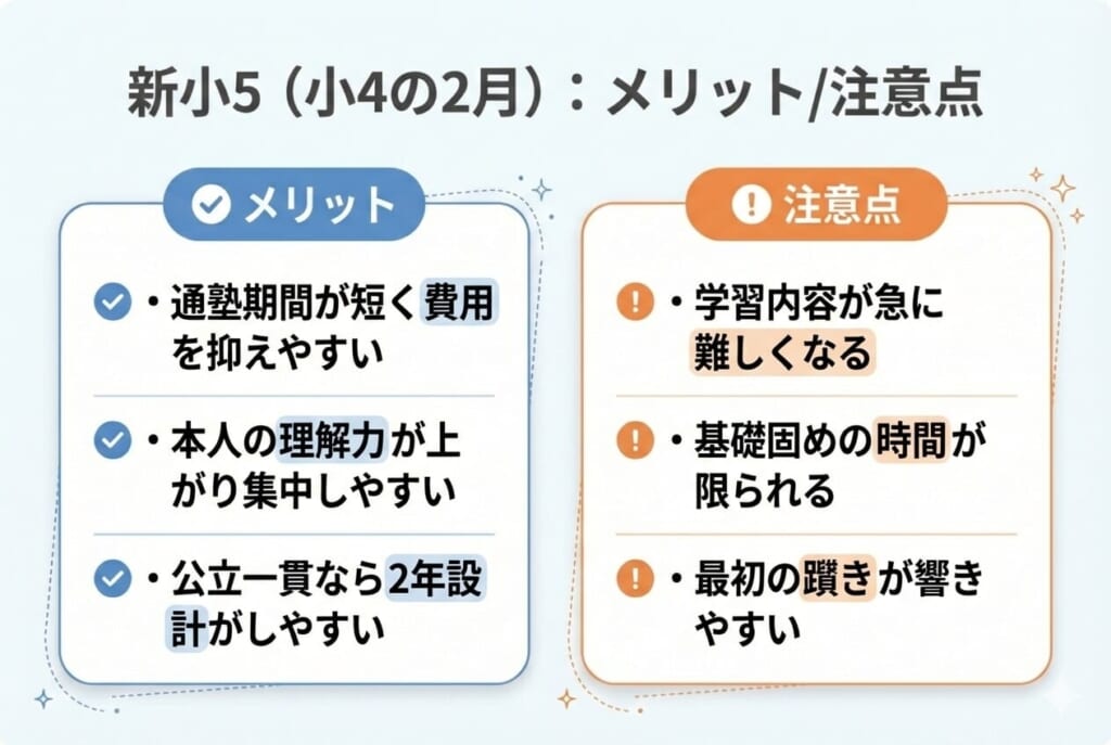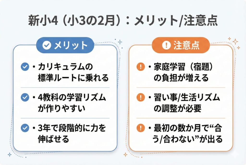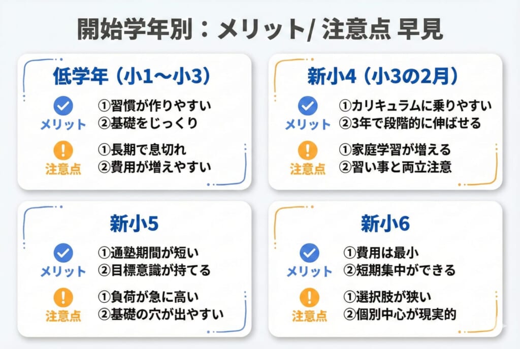 通塾開始の学年によって、学習面・費用面・精神面のバランスは大きく変わります。学年ごとのメリット・デメリットを整理します。
