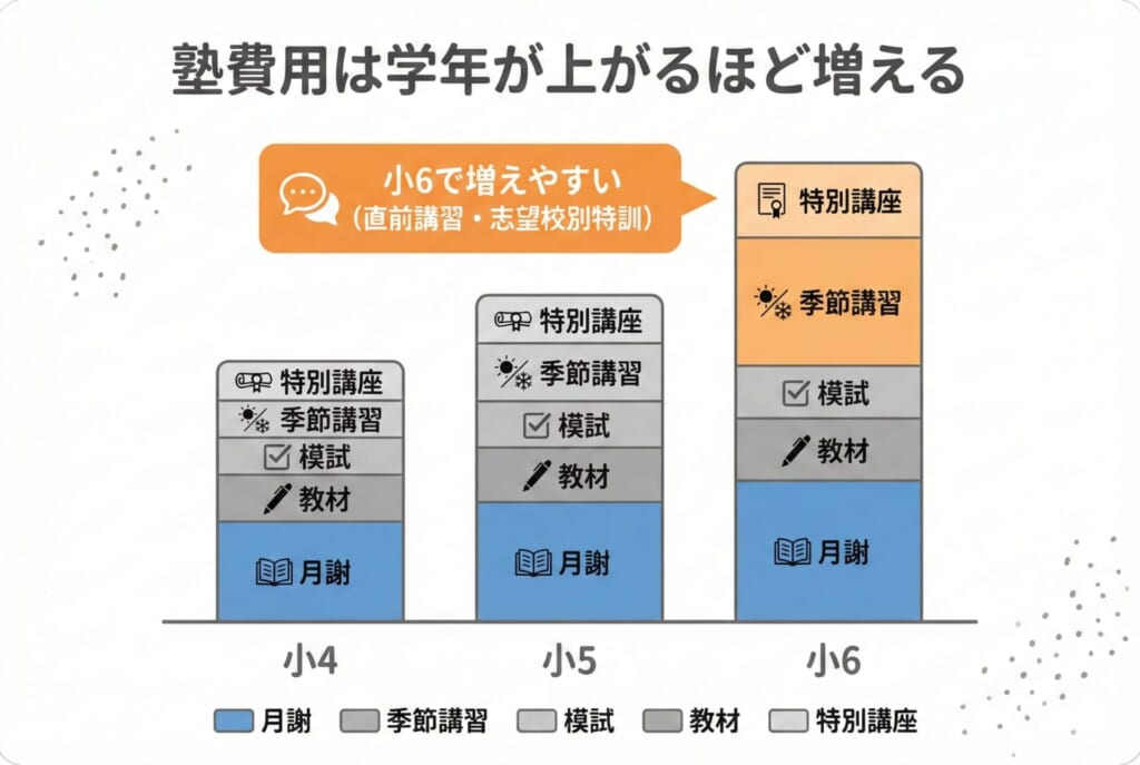 特に小学6年生では、直前講習や志望校別特訓などで費用が大幅に増加する傾向があります。