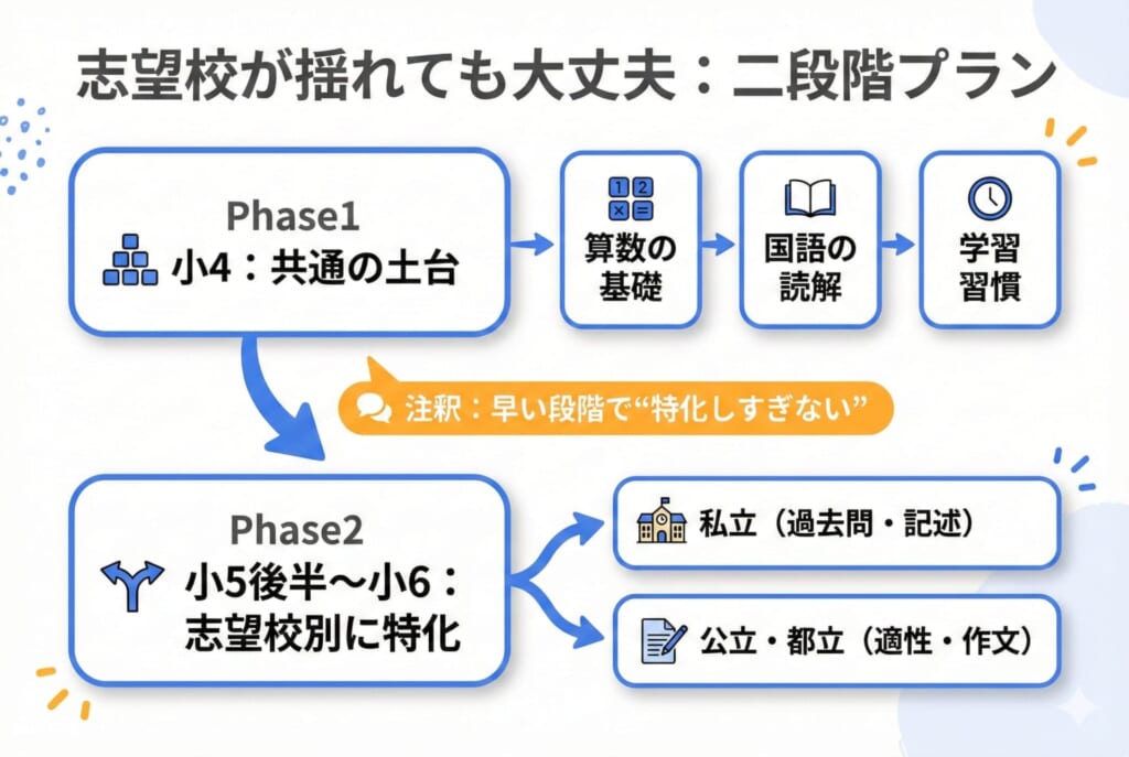 このような変更に対応するため、小学4年生の段階では幅広い基礎学力の養成に重点を置き、小学5年生以降で志望校に特化した対策に移行する段階的なアプローチが効果的です。
