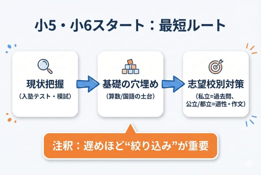 小5・小6スタートで最も避けたいのは、焦って難関校を目標に設定し、消化しきれない量の学習を詰め込むことです。まずは塾の入塾テストや模試で現在の立ち位置を把握し、そこから逆算して「現実的に手が届く志望校」を設定することが、遅めスタートの成功パターンです。