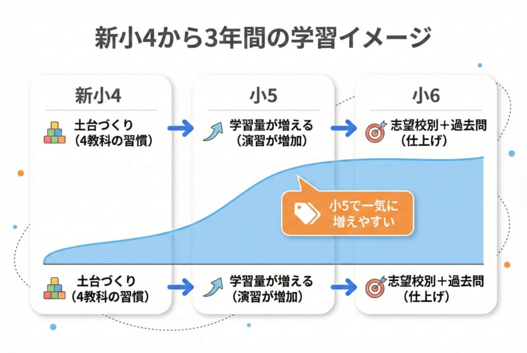また、この時期から3年間かけて段階的に学習量を増やしていくことで、小学6年生での本格的な受験勉強に無理なく移行できる利点があります。