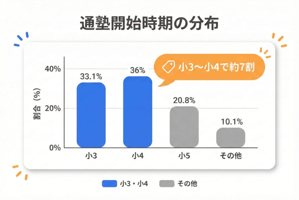 小学3年生(33.1%)と小学4年生(36%)を合わせると約69%となり、この時期に通塾を始める家庭が多数派であることがわかります。