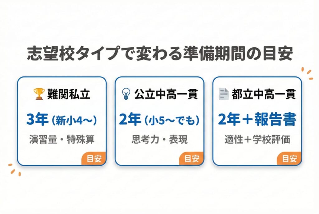 たとえば難関私立中学なら新小4からの3年間が一つの目安になりますし、公立中高一貫校であれば小5からの2年間でも対策は可能です。