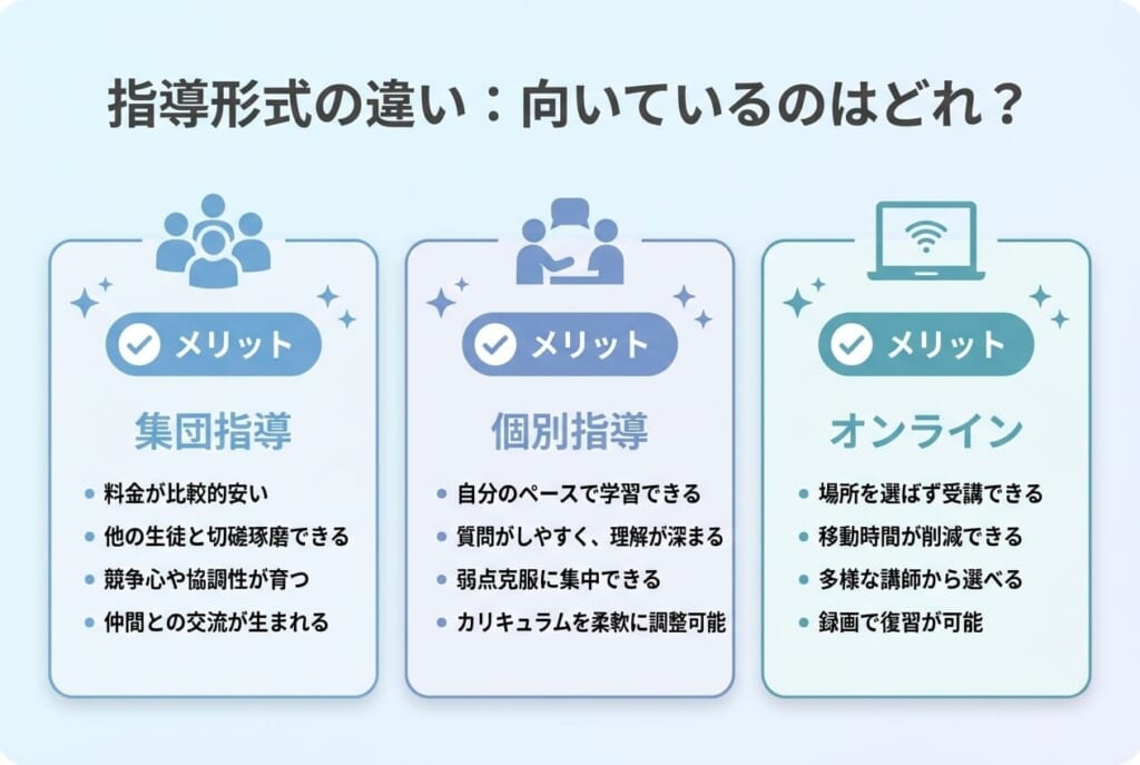• 家庭学習のフォローに時間を割けない → 自習室・質問対応が充実した塾で補う(費用は上がりやすい)