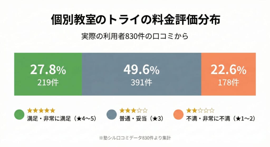 個別教室のトライは学年によって授業料の単価が異なります。小学生・中学生・高校生でどのような違いが出るか、塾シルの口コミ830件をもとに月額の分布を集計しました。