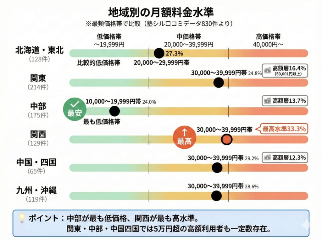 上記は首都圏の一例です。実際に利用者が支払っている金額の分布を、塾シルの口コミ830件をもとに地域別に集計しました。