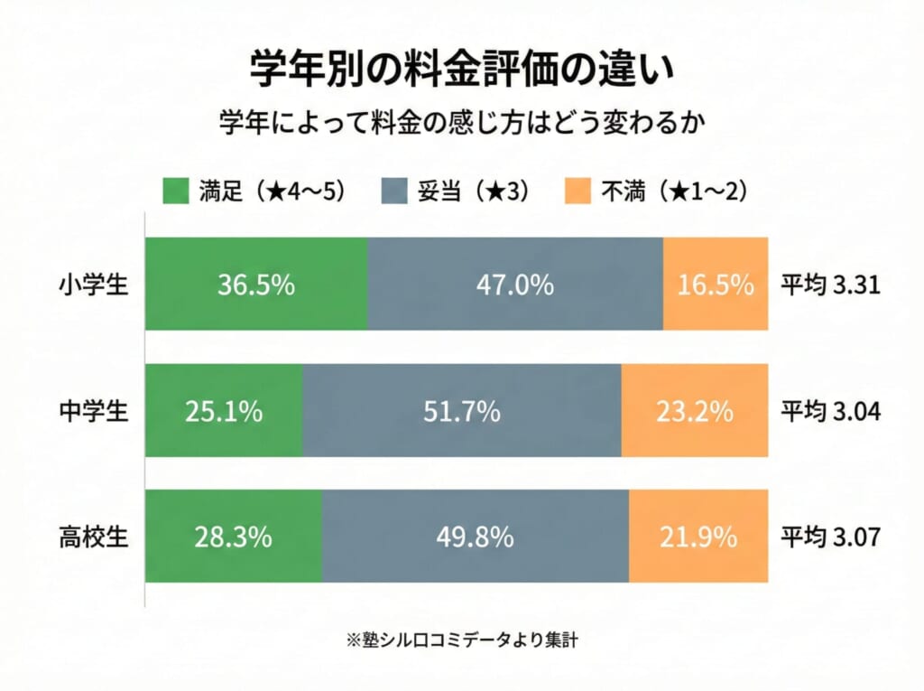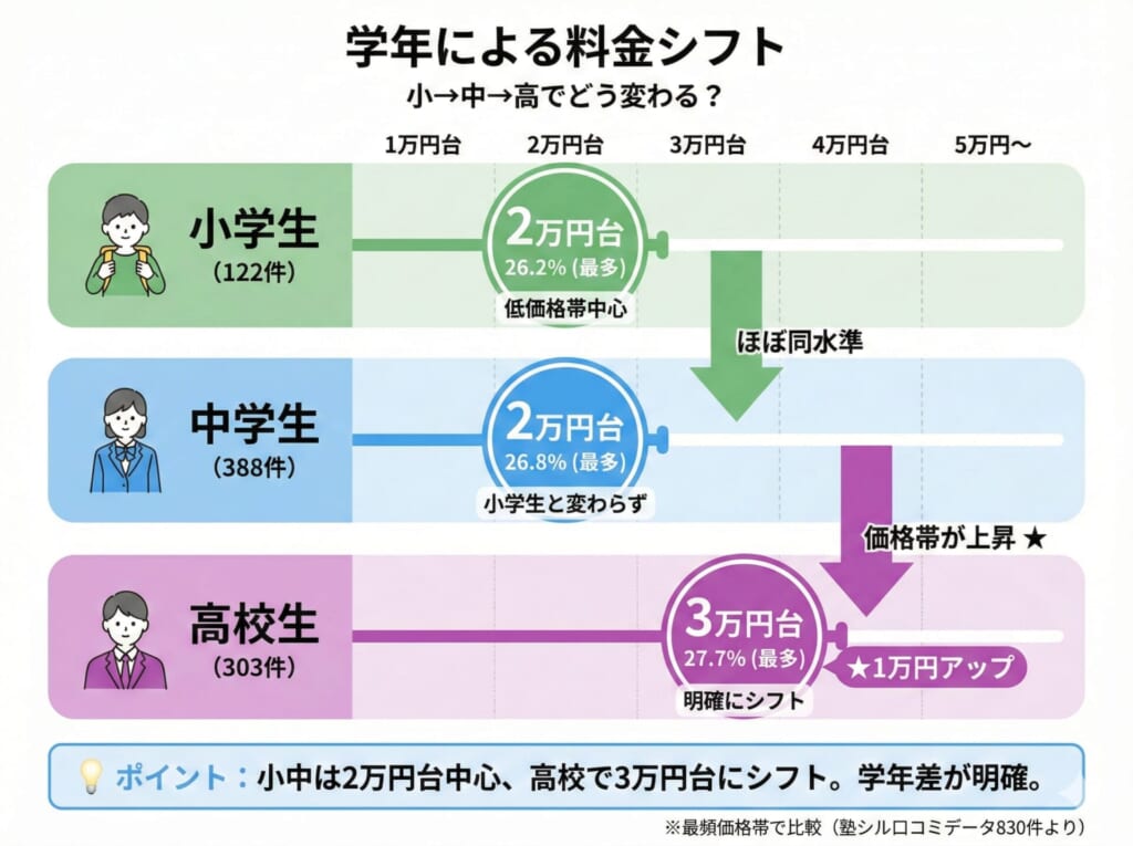 小学生・中学生は月額20,001〜29,999円が最も多く、高校生では30,001〜39,999円に移行しています。ただし、同じ学年でも講師ランク・通塾回数・地域によって幅があります。あくまで「多くの人が払っている料金帯」として参考にしてください。