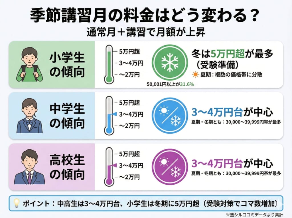 夏期・冬期ともに中学生・高校生では「30,001〜39,999円」が最多となっており、通年受講に季節講習を追加すると月額が3〜4万円台になるケースが多い傾向です。