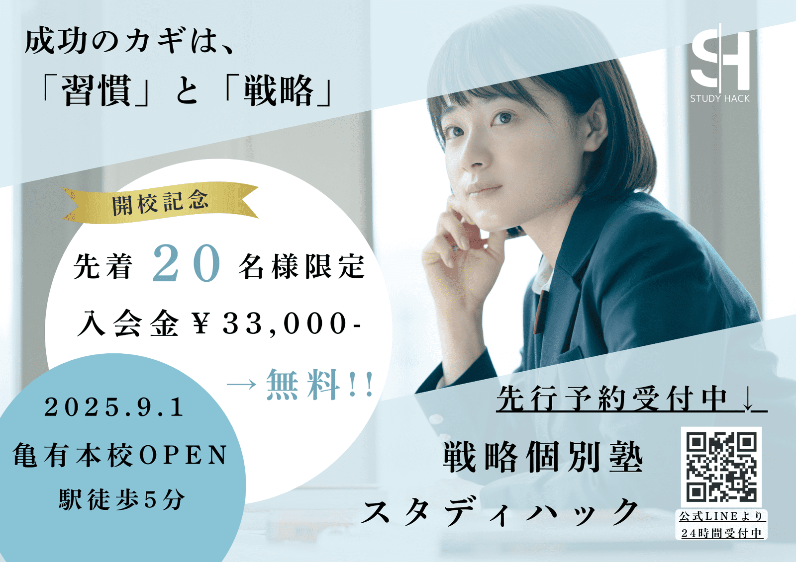 戦略個別塾スタディハックは、「何をどれくらい、いつやるか」を明確にした逆算型の学習設計で、最短ルートでの学習を提供しています。AI教材「Atama+」を活用して現在の学力や弱点を分析し、その結果をもとに講師が年間・週間・日別の戦略を個別に設計。これにより、生徒自身が学習の進め方に迷わず取り組むことが可能になります。
