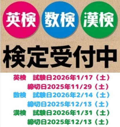 申し込み締め切りは、英検が2025年11月29日(土)漢検と数検が2025年12月13日(土)