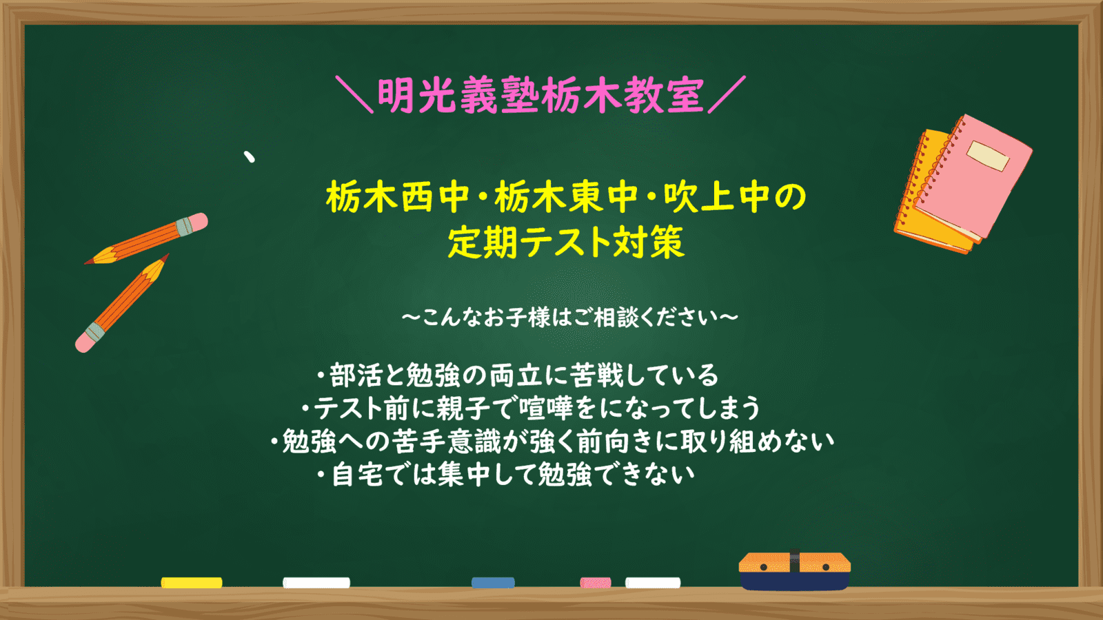 中学受験、高校受験、大学受験、医学部受験、授業・定期テスト対策、内申点対策、学習習慣の定着、総合型選抜(旧AO)対策、推薦入試対策、学校別特化対策、国公立大対策、私大対策、共通テスト対策、英検(英語検定)対策、漢検(漢字検定)対策、数学特化対策、英語・英会話特化対策、その他科目別特化対策
