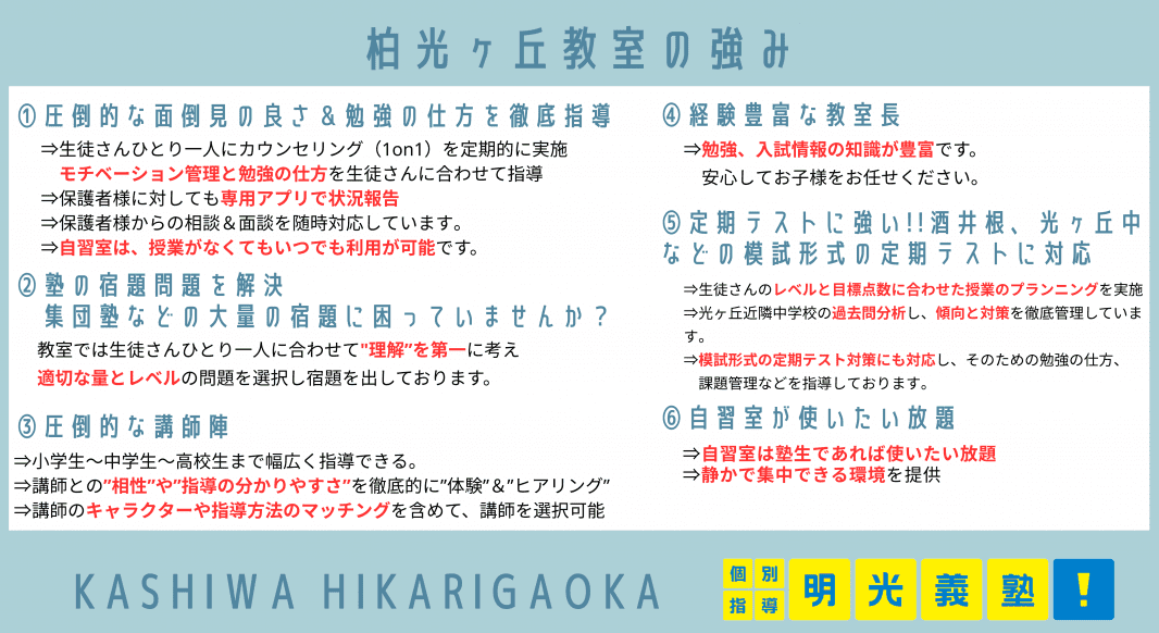 日々の勉強や受験に関する保護者、生徒の悩みは様々ですが、志望校に合格したい、将来の夢を叶えたいという気持ちは同じです。明光義塾は一人ひとりの悩みや目標に合った個別指導でサポートしていきます。