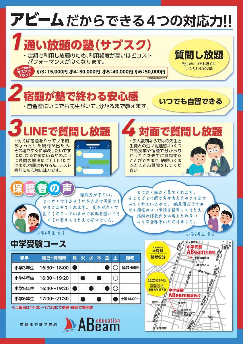 アビームでは小学3年生コースを開講します。毎週月・金曜日16:30~17:30算数・国語15,000円/月(税抜)アビームの特徴3選①少人数だからできる参加…