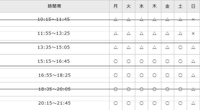 ■祝日の開校についてはその都度ご案内致します。 ■夏・冬休み期間中の開校時間は、10:00〜22:00(日曜日は13:30〜22:00)となります。 (上記△印の時間帯も夏・冬休み期間中は開校します) 詳細は毎月お配りする個人授業予定表でご確認いただけます。 ■小学生は、45分授業の設定もあります。 ■自習席は開校時間内であれば自由に使用できます。 予約などは一切不要です。 ■欠席の際の振替授業も実施しております。 毎月の振替授業の上限回数はありません。