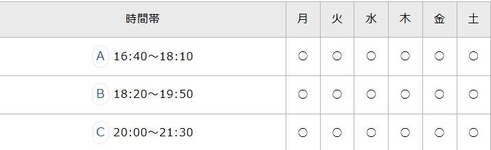 お子さまのスケジュールに合わせて、部活動や学校行事と両立しながら、無理なく勉強できるスケジュールを選べます。時間割は、月曜から土曜までの16:20~、17:55~、19:30~の各90分授業になりまして、土曜日は14:45~の授業もございます。スクールによって異なる場合がありますので詳細は各教室にお問い合わせください。