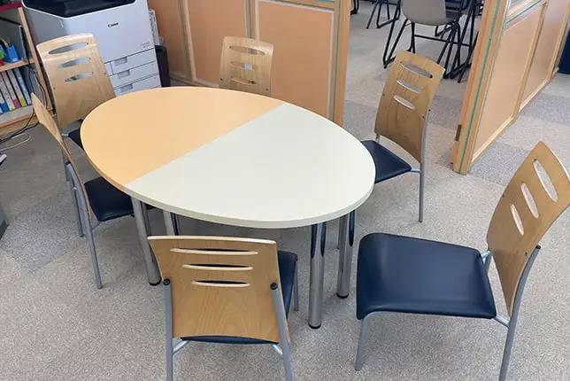 校舎内では鳥のさえずりや自然音のBGMを流し、森をイメージした落ち着いた環境を整えています。さらに、懇談スペース・授業ブース・自習室を明確に分けることで、目的に応じて集中できる学習環境を実現しました。
