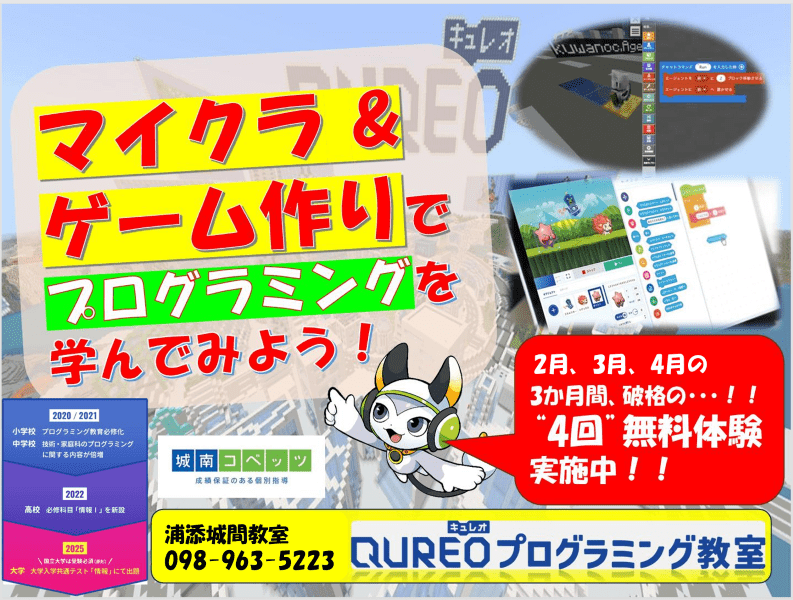QUREOプログラミング教室では、新年度に向けて一人でも多くのお子様にプログラミング学習をスタートしていただきたいという想いから、「1ヶ月無料体験」を実施いたします。