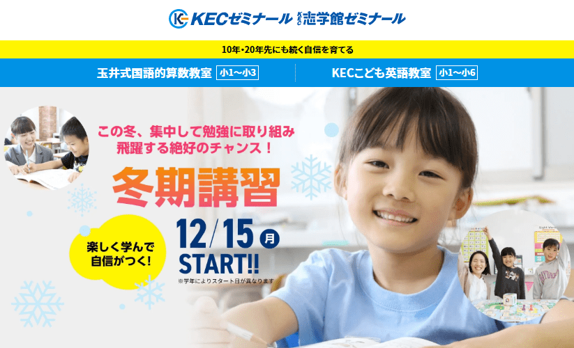 12/15(月)スタートこの冬、集中して勉強に取り組み飛躍する絶好のチャンス!◆玉井式国語的算数教室対象:小学1年生~3年生将来につながる第一歩はKECから…
