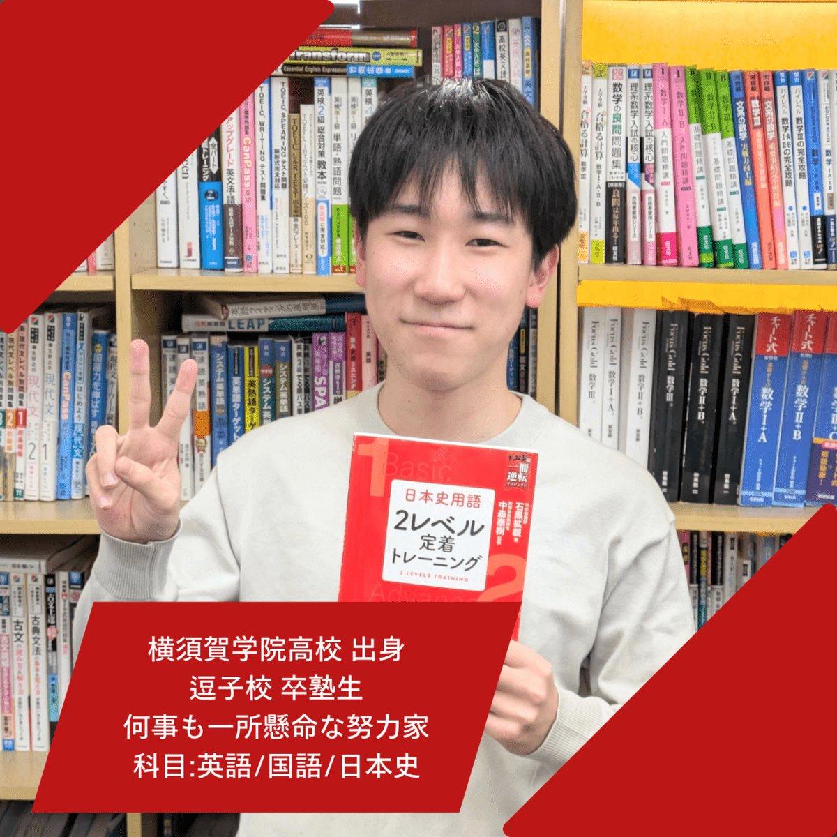 湘南学園高校出身で、仮面浪人を経験。勉強の分析が得意で、正しい勉強法を伝授する。GMARCH合格者を多数輩出した。