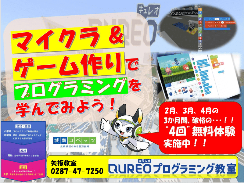 QUREOプログラミング教室では、新年度に向けて一人でも多くのお子様にプログラミング学習をスタートしていただきたいという想いから、「1ヶ月無料体験」を実施いたします。
