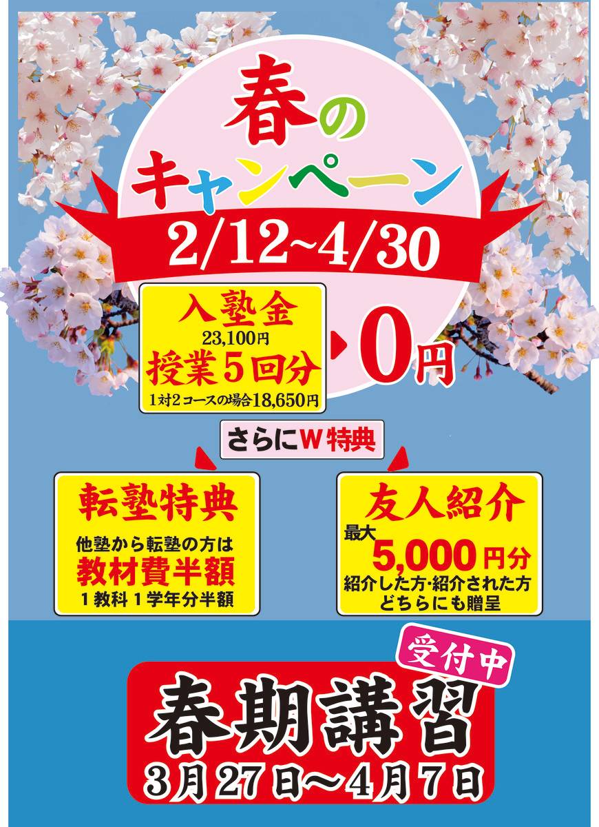 ※えんしゅう君コース・ジュニア個別指導・ジュニアEnglish・講習会のみご入会の方はこちらのキャンペーンの対象外となります。