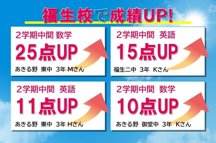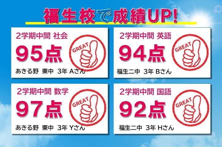 通っている学校に合わせたテスト対策ができるから内申点アップにつながります。テスト後には、弱点を分析し克服するための指導をするので、受験にも対応できる学力が身につきます。